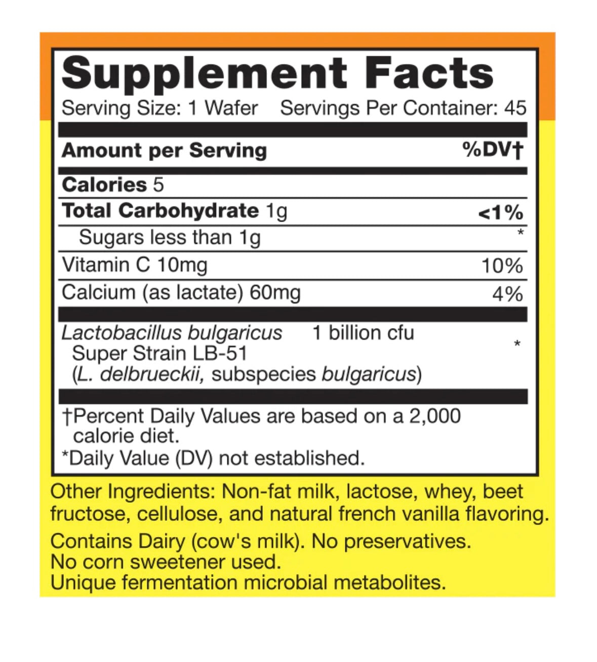 - Each wafer contains a minimum of 1 billion CFU of live, active L. bulgaricus probiotic bacteria (LB-51 super strain). Potency guaranteed through the expiration date if kept dry and refrigerated.